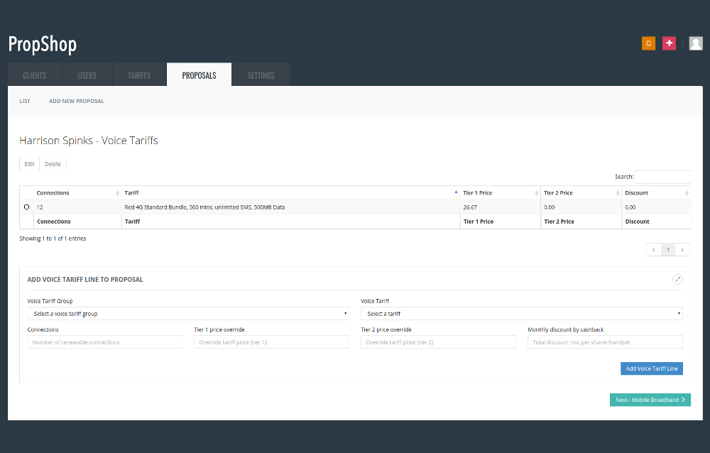 We were asked to provide an online system for sales executives to prepare PDF proposal documents for clients, based on a simple user input form based around a relatively complex set of mobile & mobile broadband tariffs. The result is a beautifully formatted PDF, fully checked for errors.